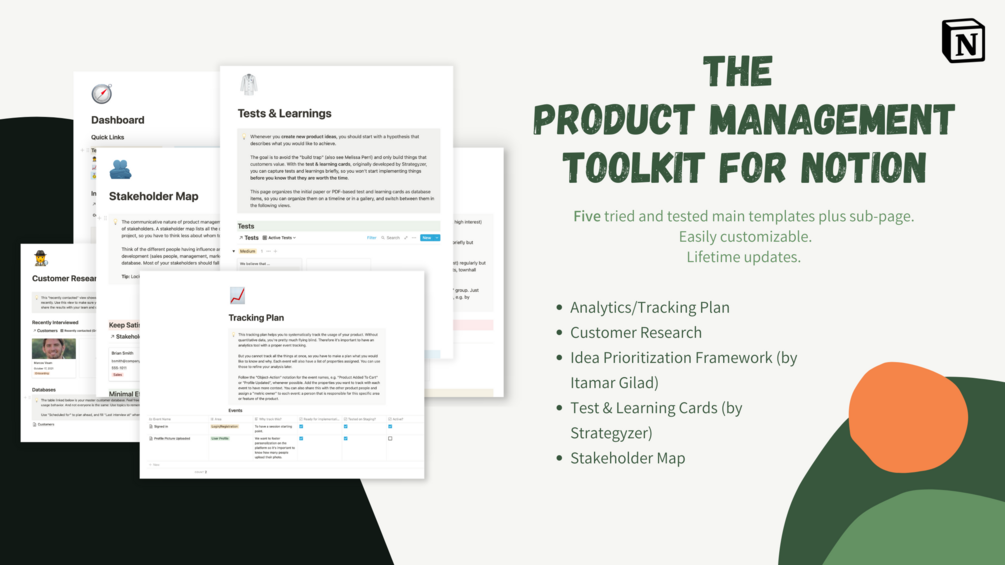 Download a set of valuable templates for Product Managers and Product Owners to organize your PM job in Notion. This will get you started with customer research and product planning.